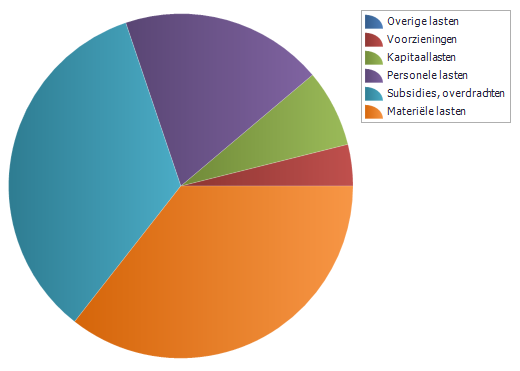 De materiële lasten bestaan uit kosten bouw- en woonrijp maken grondexploitaties (€ 11,3 miljoen), onderhoud openbaar groen (€ 0,9 miljoen), overhead (€ 3,6 miljoen), onderhoud wegen e.d. (€ 1,9 miljoen), afval (€ 1,6 miljoen), participatie (€ 1,3 miljoen), fusiekosten (€ 1,3 miljoen) en overige (€ 5,3 miljoen)